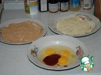 Смешайте на тарелке два вида муки, соль и 1 чайную ложку хмели-сунели, на 2 тарелке размешайте яйца с кимчи, на третьей тарелке размешайте панировочные сухари с 1 чайной ложкой хмели-сунели. |