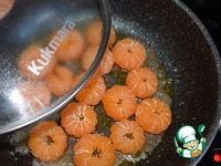 Кладём на сковороду мандарины. Если у вас крупные, разрезанные мандарины, то кладём срезом вниз. Жарим мандарины на медленном огне 15 минут с закрытой крышкой. |