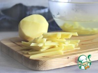 Картофель почистить, помыть, нарезать длинной соломкой шириной около 5 миллиметров. Картофельную соломку сложить в чашку и залить кипятком, оставить на 15 минут. |