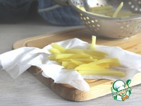 Картофельную соломку откинуть на дуршлаг, хорошо промыть холодной водой, обсушить на салфетке. |
