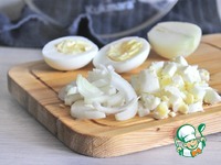 Репчатый лук почистить, сполоснуть холодной водой и порезать тонкими полукольцами. Яйца и нарезать небольшими кусочками. |