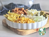 А затем консервированную кукурузу, полукольца репчатого лука и картофельные соломки – фри. В середину блюда - майонез, который по вкусу посолить и поперчить. |