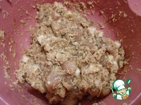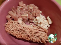 Хорошо перемешиваем в миске наше мясо с салом, фаршем и чесноком, солим и добавляем остальные специи. |