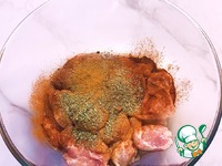 Первым делом курицу приправляем солью, сахаром, перцем, острым перцем, прованскими травами, копченой паприкой, зирой, корицей, приправой для курицы. |