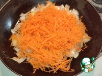 В разогретую сковороду налить растительное масло. Лук нарезать кубиками. Обжарить 3-4 минуты. За это время морковь натереть на тëрке для корейской моркови. Добавить к луку, обжаривать 4-5 минут. |