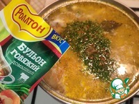 Добавить в суп мелко нарезанный укроп и говяжий бульон. Поперчить и посолить по вкусу. Варить 7-10 минут. Готово. |