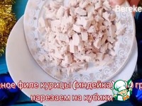 Отваренное филе нарезаем на кубики далее добавляем соль, перец по вкусу, орехи, чеснок натертый через мелкую терку, затем добавляем майонез и хорошо перемешиваем. |