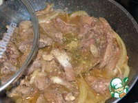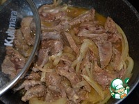 Кладём печень к луку, начинаем жарить на сильном огне, чтобы она немного стала зажариваться, потом 15 минут жарим на среднем огне при закрытой крышке, периодически помешивая. |