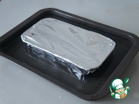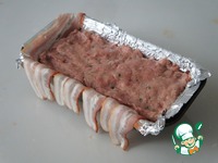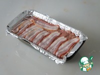 Небольшую квадратную форму выложить фольгой. Затем - кусочки бекона, оставив концы свисать. |