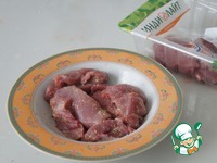 Филе бедра нарезать крупными полосками поперёк волокон. Я взяла не всю пачку, чуть больше половины. Посолить, добавить 1 ч. л. горчицы, перемешать, оставить мариноваться. |