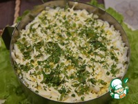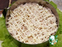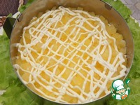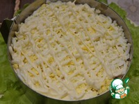 Ананасы тщательно отцедить от сиропа и нарезать маленькими кубиками. Выложить на яйца. Количество - по вашему вкусу, у меня вся баночка не уходит. Нанести на ананасы сеточку из майонеза. |