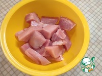 Подготовленное куриное филе режем на небольшие кусочки. Перекладываем в глубокую миску. |