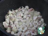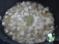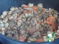 Добавляем лавровый лист и выливаем 100 мл бульона. Тушим под крышкой на медленном огне минут 50. Затем снимаем крышку и продолжаем готовить до выпаривания жидкости. |