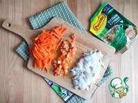 Морковь (1 шт.) нашинковать соломкой, болгарский перец (1 шт.) нарезать мелкими кубиками, репчатый лук (1 шт.) нашинковать полукольцами |