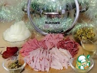 Нарезаем мясные и колбасные изделия соломкой, здесь подойдут и копчёная колбаска, и ветчина, отварное мясо и сосиски - чем разнообразнее, тем вкуснее. Все они уже с разными специями, потому я добавила только острый молотый перец.