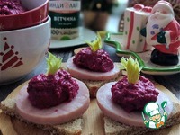 Нарезаем ветчину не совсем толстыми ломтиками. Для этого количества свекольной закуски уйдёт весь батончик ветчины. Я для примера сделаю 3 бутерброда. Ветчину выкладываем на хлеб. |