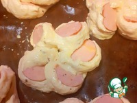 Из получившегося теста скатать 12 булочек. Каждую приплюснуть и, положив в нее сардельку, защипнуть как пирожок. Перевернуть "швом" вниз |