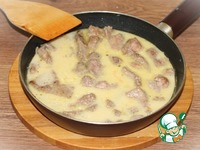 15. Добавить к печени жидкий бульон (0,5 стакана от лапши), сливки 10% и перемешивая довести соус до небольшого загустения. |