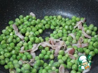 Добавить зеленый горошек, черный перец и обжаривать пару минут. |