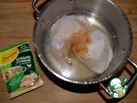 Остывшее вареное куриное мясо отделяем от костей, режем полосками. |