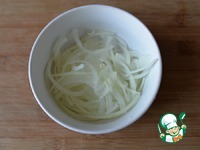 Лук режем тонкими кольцами, полукольцами или стрелками, заливаем уксусом и кипятком. Отставляем мариноваться на 20 минут. |