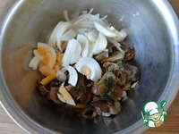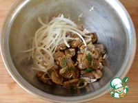 Добавляем к курице маринованные шампиньоны и маринованный лук. Я добавила жареные маринованные шампиньоны по рецепту https://www.povareno k.ru/recipes/show/17 7749/. Можете брать любые. |