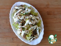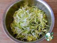 Пекинскую капусту тонко шинкуем, кладём в салат. |