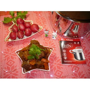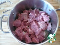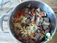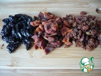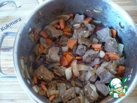 Затем добавляем томатную пасту, свежемолотый черный перец, соль по вкусу и все хорошо перемешиваем. Теперь необходимо добавить в кастрюлю воду, еще раз все перемешать, довести до кипения, убавить огонь ниже среднего, накрыть крышкой и тушить 1 час. Через час добавляем к мясу промытый изюм, крупно нарезанные курагу и чернослив, перемешиваем и тушим на маленьком огне под закрытой крышкой еще 30 минут. Спустя полчаса мясо готово.