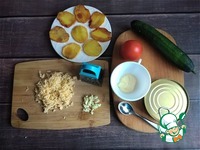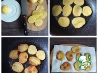 Количество ингредиентов даю на одну банку шпрот. Это примерно 16 рыбок. Сделаю для примера 4 шт. Картофель лучше брать крупный, в величину рыбки по длине. Значит нужно его нарезать не толстыми дольками вдоль, разрезав пополам, где самая большая величина. Остатки у вас уйдут куда-то в другое блюдо. Если у вас нет крупного картофеля, то берите какой есть и рассчитывайте по 2 дольки на бутерброд. Греем сковороду с маслом хорошо, солим масло и выкладываем в один ряд дольки картофеля. Обжариваем до готовности с обеих сторон до красивого цвета. Это быстро. Обязательно выкладываем дольки обжаренные на салфетку и хорошо промокаем, чтобы убрать лишнее масло. |