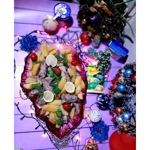 Готовое блюдо переложить в красивую посуду, украсить дольками лимона, зеленью и подавать к новогоднему столу. Приятного аппетита! |