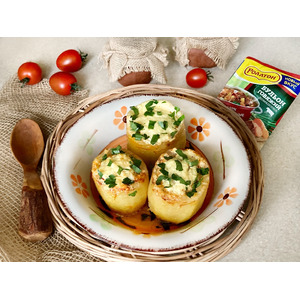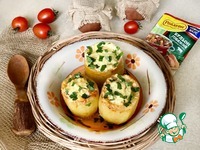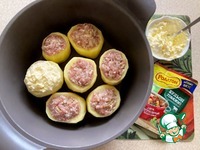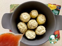 На 1 л воды подготовьте бульон (добавьте 2 ч л бульона Роллтон в кипяток и перемешайте, дайте пару минут постоять), добавьте томатную пасту. Налейте бульон в кастрюлю с нашими бочонками (бульон должен немного не доходить до их верхушек). Накройте кастрюлю крышкой, доведите до кипения, убавьте огонь и готовьте блюдо около 1 часа. Времени на приготовления может потребоваться немного больше или меньше, всё зависит от сорта картофеля и его размера. Поэтому во время приготовления проверяйте, чтобы картофель не развалился, и, в тоже время, и картофель, и фарш хорошо приготовились. |