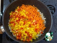 Затем к луку добавьте нашинкованные перцы и морковь. |