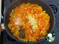 К обжаренным овощам добавить измельченный чеснок, соль и перец по вкусу. |