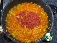 И в заключение добавьте помидоры или как у меня, томат домашнего приготовления. Все перемешайте, влейте воду и доведя до кипения, протушите 5 минут. |
