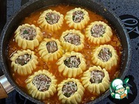Тесто раскатайте в пласт, толщиной 3 мм и вырежьте круги. Сформируйте тефтели в виде открытых хинкали. |
