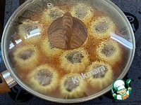 Поставьте все мешочки на овощную подушку в сковороду, доведите до кипения. |