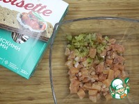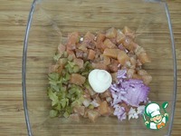 Очень мелко порезать корнишоны и добавить к форели, порезанной небольшим кубиком. |