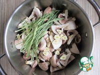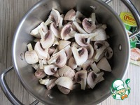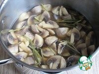 Грибы нарежьте на 2-6 частей в зависимости от размера. Мелкие можно оставить целыми. Выложите в кастрюльку. |