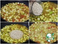 Всыпать перловую крупу, хорошо перемешать, довести до кипения и готовить на небольшом огне под крышкой 10 минут. |