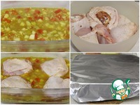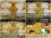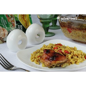 Переложить перловку с овощами в форму для выпечки, сверху выложить бедрышки (я предварительно их посолила и поперчила). Накрыть форму фольгой и поставить в духовку, разогретую до 190°С, на 45 минут. |