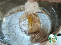 Осторожно приподнимая концы плёнки, стяните её в узелок. Хорошо закрутите, чтобы получился мешочек с яйцом внутри. |