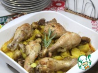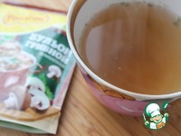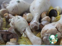 Выкладываем на нее курицу вместе с соусом. Добавляем шампиньоны и маринованные грибы. Перчим по вкусу. Соль не добавляла. тк бульон соленый. |