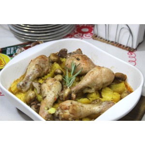Форму для запекания сбрызнуть оливковым маслом. Нарезать крупно картофель, выложить в форму перемешать, поперчить. Добавить веточку розмарина и запекать в разогретой до 190 градусов духовке 20 минут. |