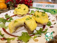 Противень накройте фольгой, смажьте растительным маслом (можно также использовать и жаропрочную форму). Выложите обжаренные медальоны и сверху - по 1 ст л грибного соуса. |