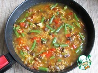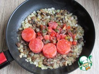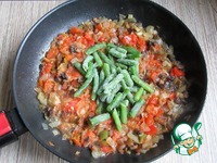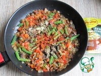 Добавьте томатное пюре и сладкий перец (у меня все замороженное). Готовьте 3-4 минуты, помешивая. |