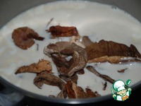 Смешайте пиво со сметаной, вскипятите, добавьте сухие грибы, сухой чеснок и посолите. Снимите с огня и оставьте под крышкой. Поджарьте репчатый лук, нарезанный полукольцами. |