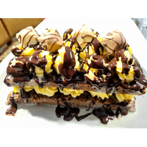 6. Первую половину кладу на блюдо и отсаживаю с помощью кондитерского шприца крем, затем накрываю второй половиной и отсаживаю крем на эту часть коржа, сверху поливаю не горячей, теплой шоколадной помадкой.