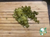 В миску добавить обжаренный лук, маринованные огурцы, майонез и 1 ч. л. горчицы. Майонез вполне заменяется сметаной или густым греческим йогуртом. |