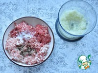 Пока тесто отдыхает готовлю начинку для пельменей. Репчатый лук измельчаю в блендере, добавив для сочности пару ложек воды. В фарш добавляю луковое пюре, соль, смесь перцев молотую и соль. |