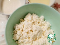 Далее вливаем вино, вводим творог. Хорошо все перемешиваем и начинаем вводить просеянную муку, заранее смешанную с ванилином, разрыхлителем и щепоткой соли. |